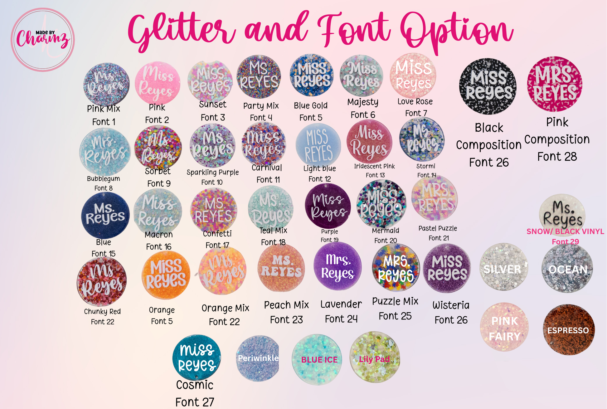 - Round Name Plate is approximately 2 inches and is made with acrylic, uv resin, glitters and permanent vinyl. Vinyl is sealed with uv resin. Name is only printed on the front side ONLY.