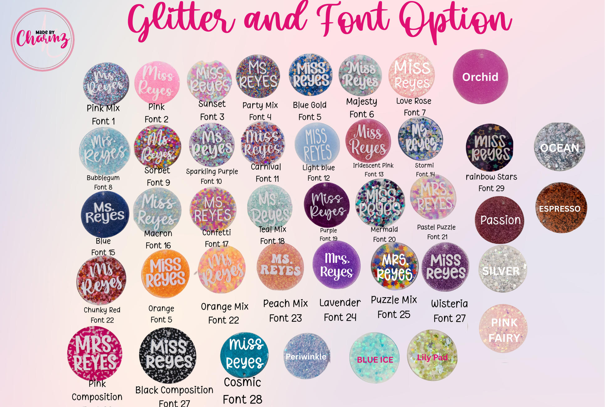 - Round Name Plate is approximately 2 inches and is made with acrylic, uv resin, glitters and permanent vinyl. Vinyl is sealed with uv resin. Name is only printed on the front side ONLY.